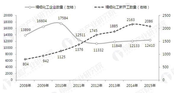 2009-2015年我國精細化工企業(yè)數(shù)量與新開工項目數(shù)量對比(單位:個,項)
